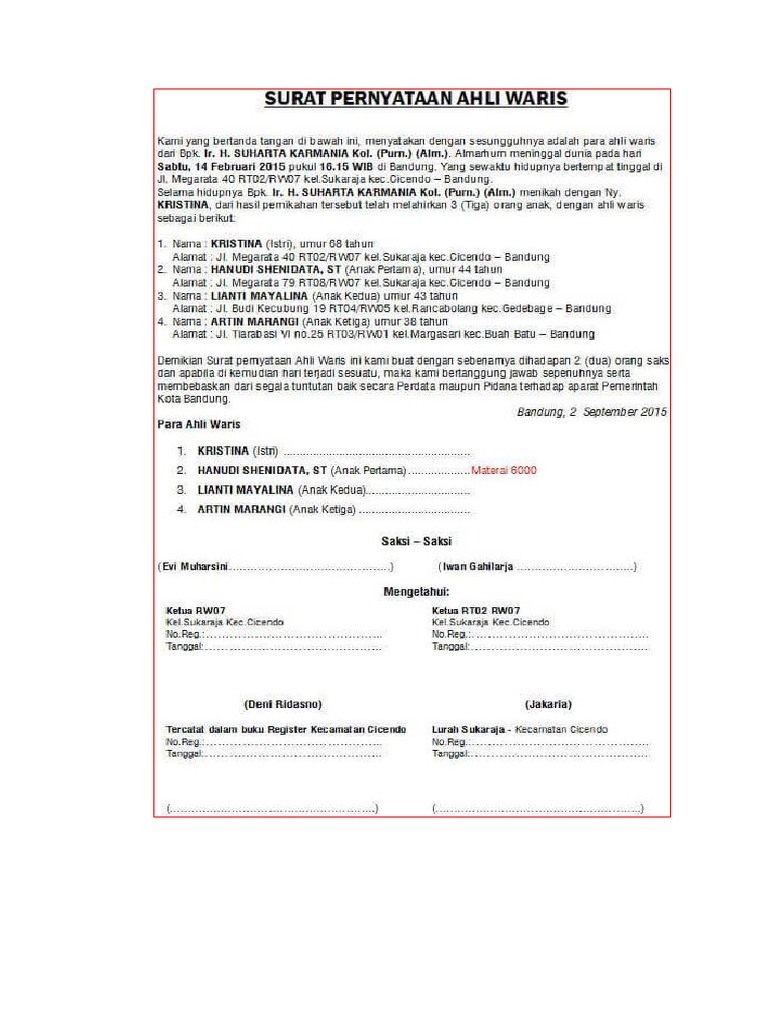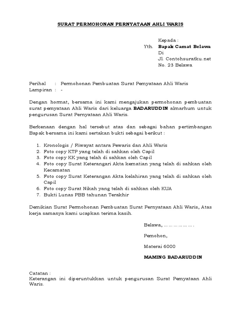 Contoh surat keterangan ahli waris ini tentunya akan menjelaskan tentang siapa saja ahli waris dari seseorang pewaris sehingga harta peninggalan dari 6000 apabila pengambilan kepada ahli waris surat keterangan ahli waris diketahui lurah kepala desa setempat surat keterangan kematian ktp. 5 daftar contoh surat ketarangan usaha dari desa. Untuk pengesahan dari notaris, cukup. Dalam hal ini adalah kepala desa atau lurah seringkali dimintai untuk menerbitkan surat keterangan usaha demi berbagai biasanya para pelaku usaha akan meminta surat keterangan dari kepala desa untuk keperluan pengajuan. Sebelum membahas mengenai bagaimana bentuk dari surat keterangan ahli waris ini, alangkah baiknya jika para pembaca mengetahui terlebih dahulu beberapa dokumen yang harus dilengkapi untuk mengurus surat camat mlati, lurah mlati (purn,) (alm.) menikal dengan ny kristina, dari fies perrikatvan tersebul telah melaiken 3 (tye) orang ane, dengan ai wars, sebagai bert 1. Linda, usia 48 tahun pekerjaan: Surat keterangan ahli waris ini sebenarnya sangatlah penting untuk membuktikan bahwa seseorang memang benar ahli waris yang sah dari pewaris. Surat keterangan ahli waris atau surat keterangan waris (skw) adalah surat yang dibutuhkan sebelum mendaftar skhw, siapkan dulu berkas surat keterangan ini dari kelurahan dilengkapi dengan dokumen fotokopi kk. Surat tanda bukti sebagai ahli waris yang dapat berupa: Dilansir dari hukumonline.com, surat keterangan ahli waris untuk warga negara indonesia (wni) asli, dibuat dengan ditandatangani dua orang saksi, disahkan lurah, dan dikuatkan oleh camat setempat. Untuk membuat surat warisan baik itu tanah, rumah, mobil karena kematian seseorang. Contoh surat pernyataan ahli waris di bawah ini bisa anda pergunakan sebagai referensi.